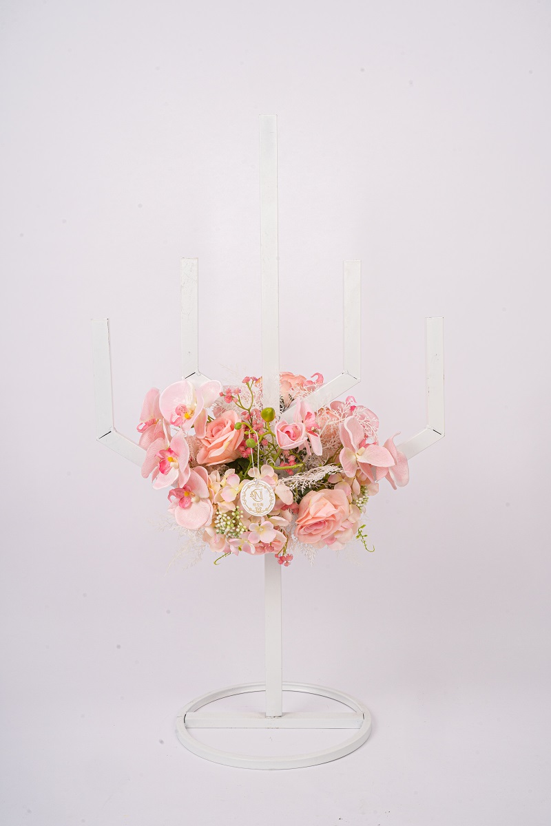 蝴蝶兰也是营造大型桌花的好花材,她的花茎柔韧性、力度都恰到好处,既能突出于花球表面形成弧度,有效地扩大桌花直径,又通过花瓣的柔软与花球融为一体。在一个紧实花球的表面装饰蝴蝶兰花枝,能快速有效地增长桌花整体的视觉感。